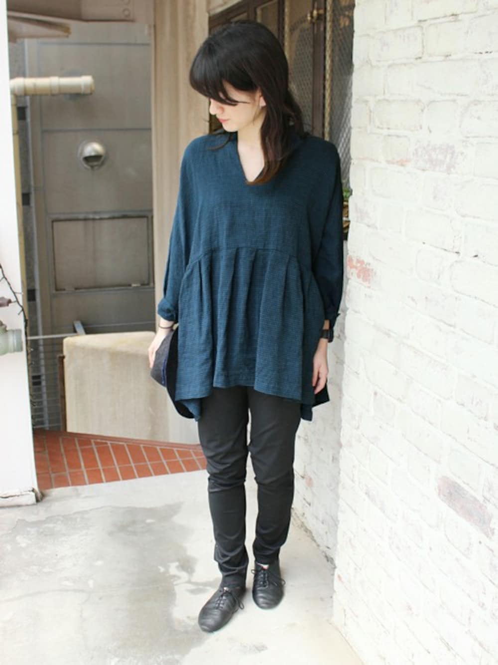 大人なギャザーブラウスの着こなし。 すっきりとスリムパンツを合わせて。 シンプルなブラウススタイルです。