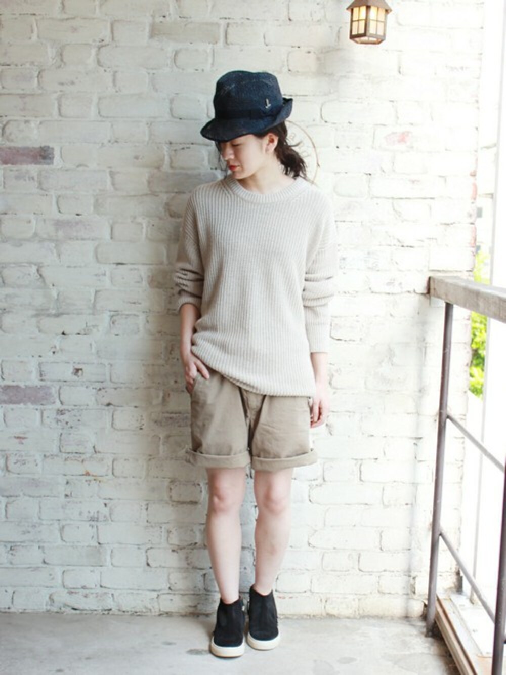 ベージュ×ブラック カジュアルなシーンで活躍のハーフパンツスタイル。 ハットやブーツにブラックを合わせて引き締め役に◎