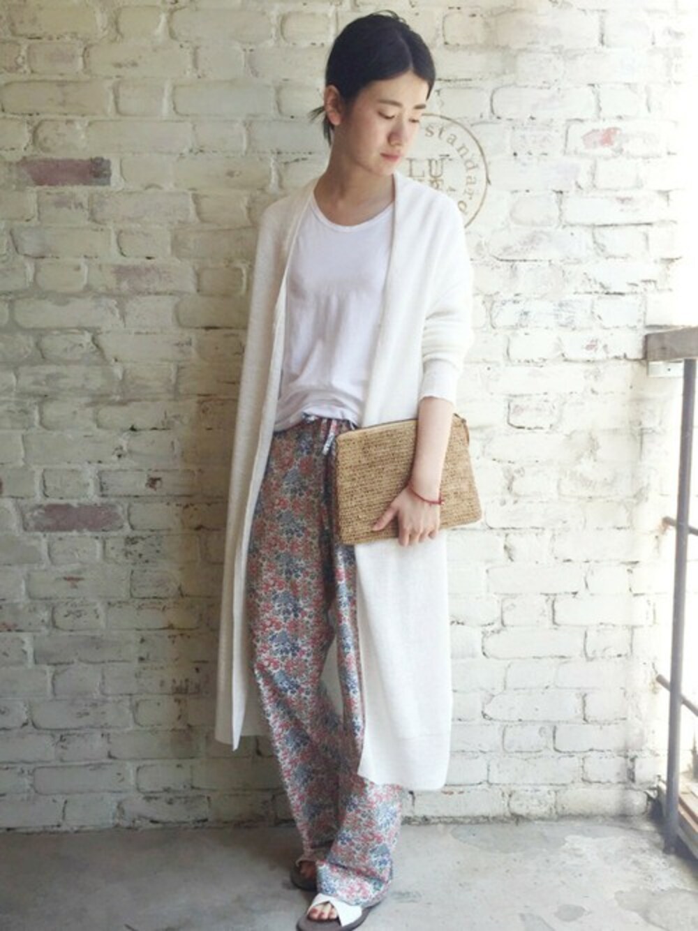 ホワイトカーディガンスタイル 大人な雰囲気にまとめてくれるロングカーディガンの着こなし。 キャッチーなパンツをアクセントに◎