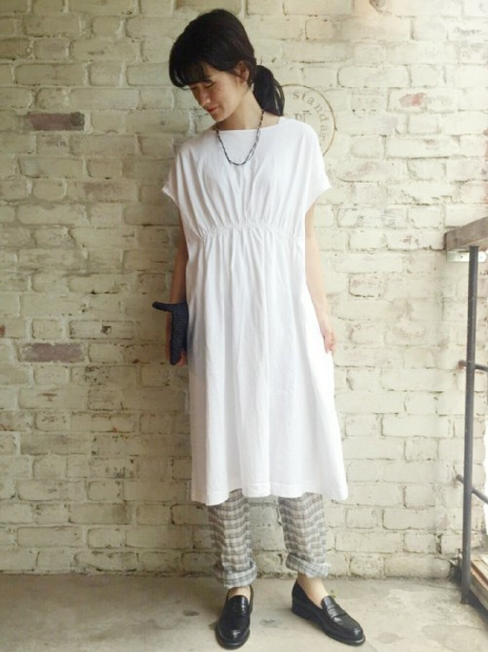 ワンピーススタイル◎ 春夏にぴったりな爽やかなワンピーススタイル! イージーパンツを重ねてラフな着こなしに◎