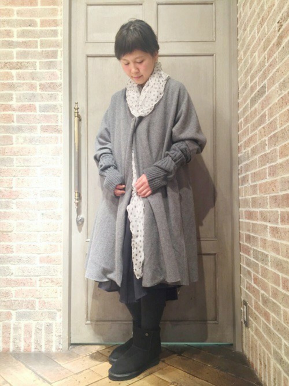 ワンピースかけるロングカーディガンでふんわりしつつ、オトナな着こなしに◎ 冬に欠かせないムートンブーツを合わせて。