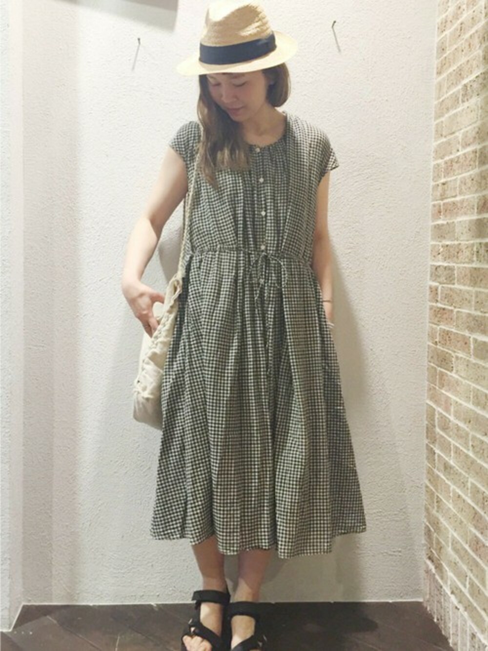 ワンピース×サンダル さらりと着こなしたいワンピース。ハット、サンダルをアクセントに◎