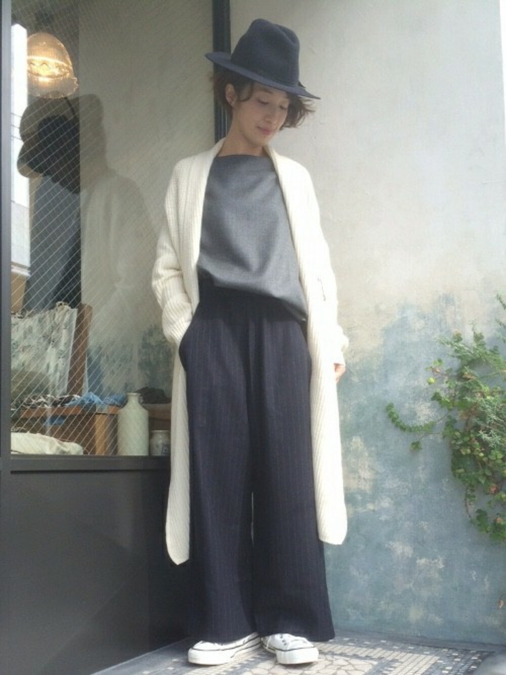 ワイド×ワイドコーディネート ダークトーンでまとめたスタイルに白のカーディガンをプラス。 足元も白のスニーカーで軽やかに◎