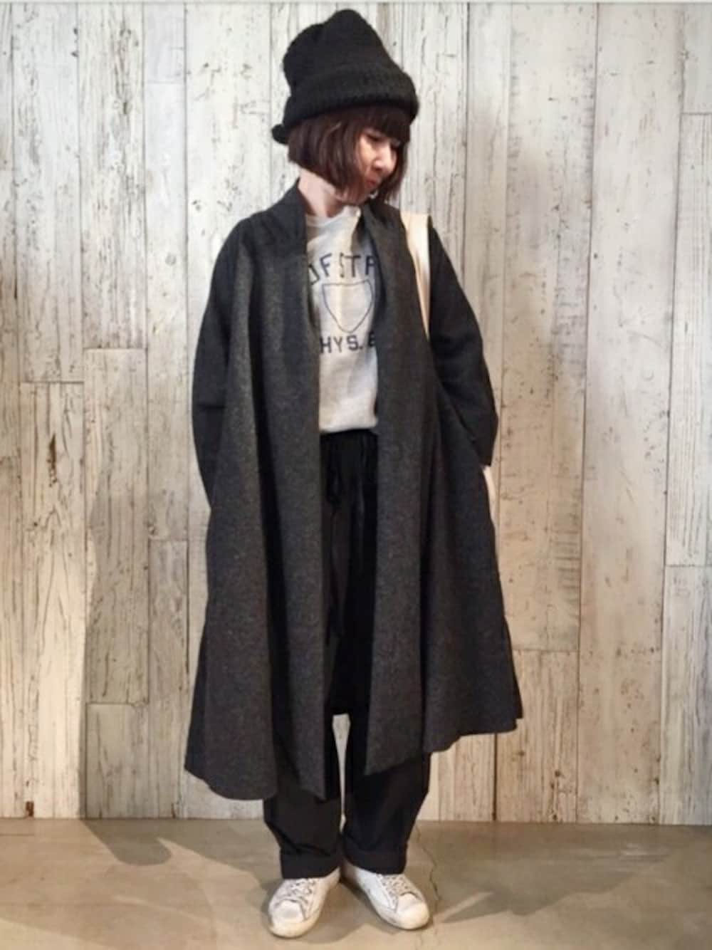 カジュアルなダークトーンコーディネート! 重くなりがちなダークトーンスタイルはプリントアイテムを合わせて軽さをプラス。 ロングシルエットの羽織が大人なカジュアル感を演出してくれます。