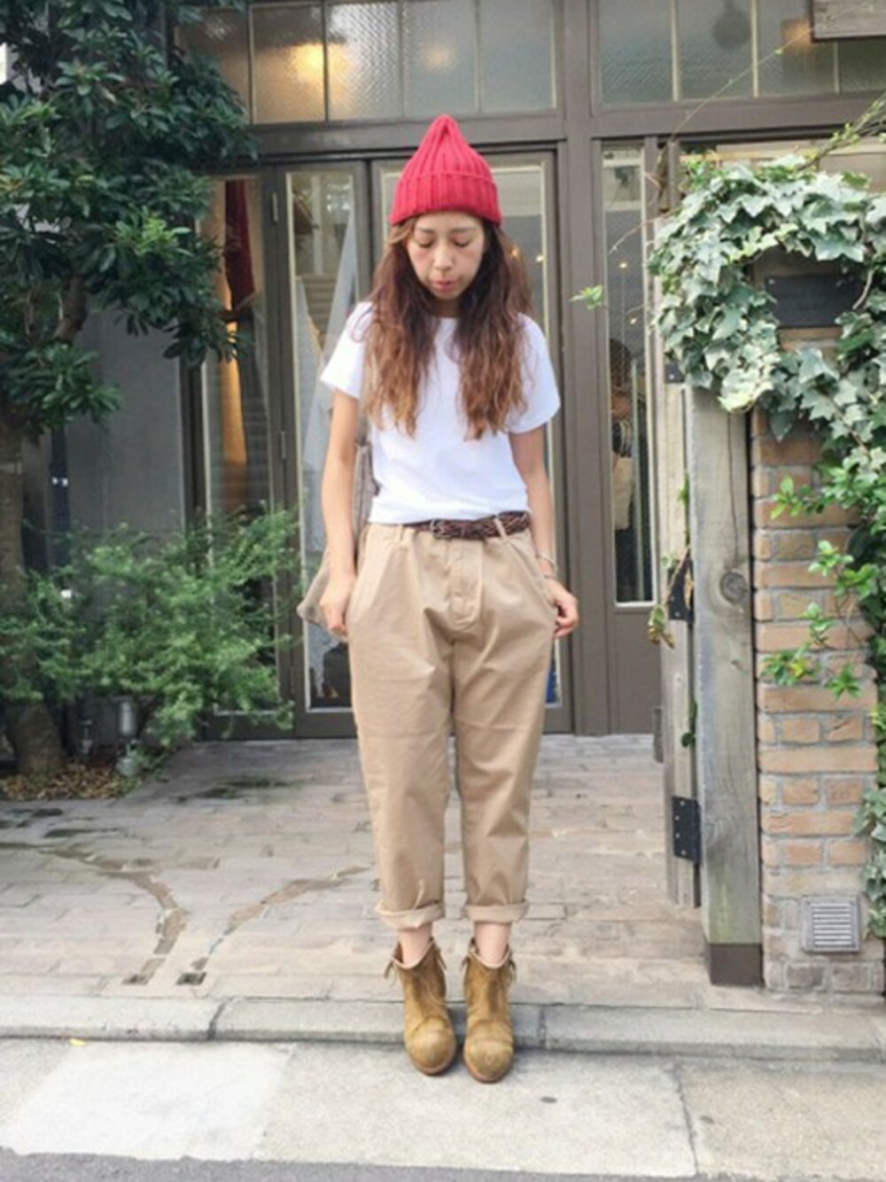 Tシャツ×チノパンツ シンプルなチノパンツスタイル◎ ショートブーツですっきりとまとめ、赤のニットをアクセントに!