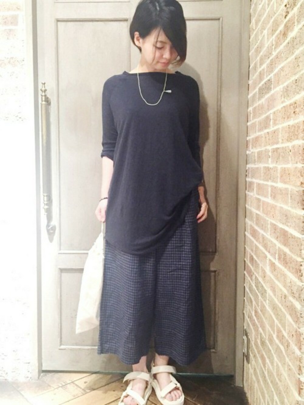 トーンonトーン ネイビーアイテムで揃えた着こなし。 ネックレス、サンダル、バッグで白をプラスして軽さをプラス。 長めのカットソーはブラウジングすることで、ワイドパンツにも◎