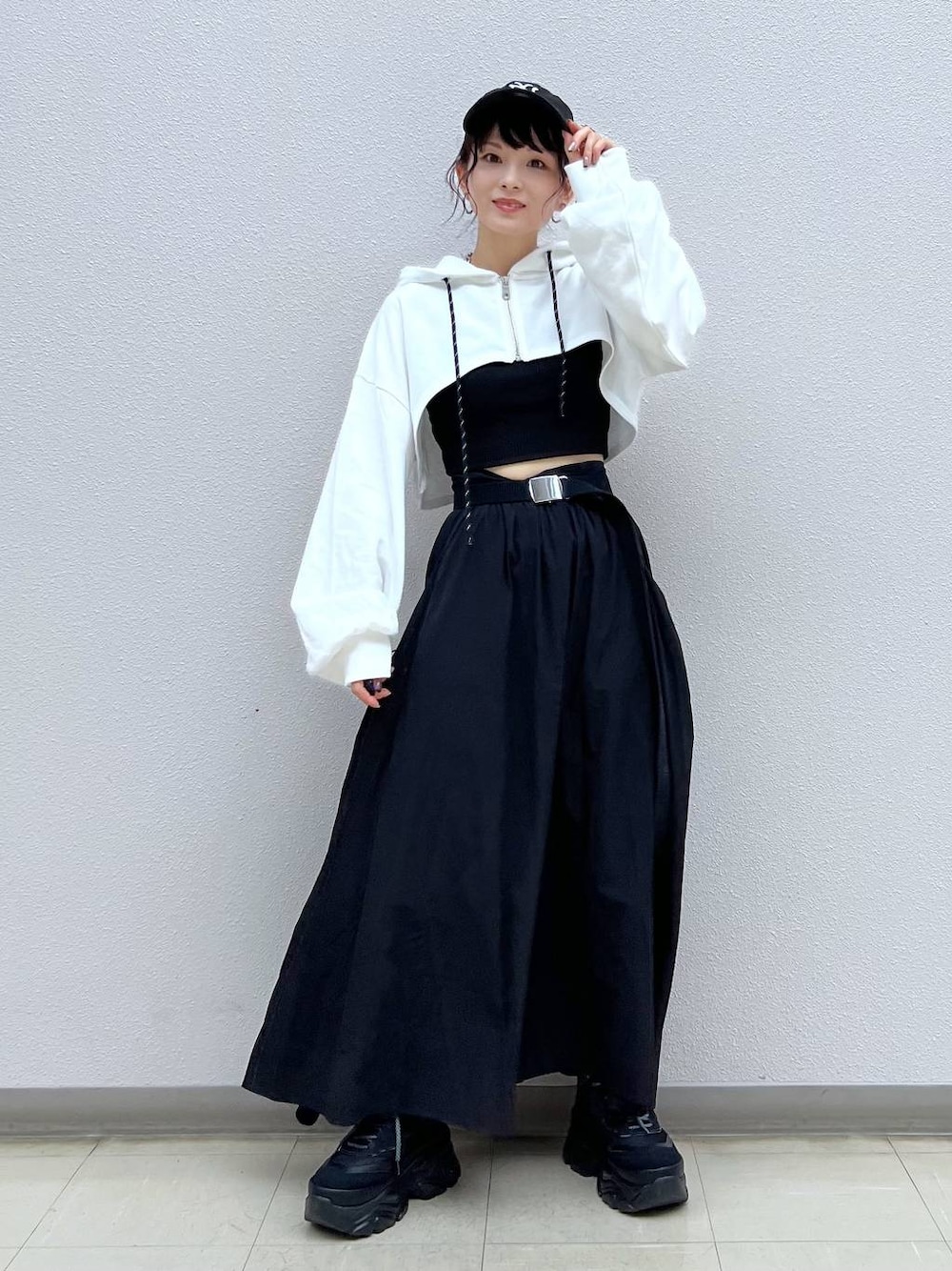 リアルバイコーデ ⭐️ ボレロパーカーはとにかく着痩せします☺︎ ショート丈でウエスト周りがしっかり出るので Aラインスカートと合わせることで よりスタイルUP⤴︎が叶います \( ˆoˆ )/ 何度も着用しているこのスカートは とりあえずおすすめです(笑)