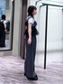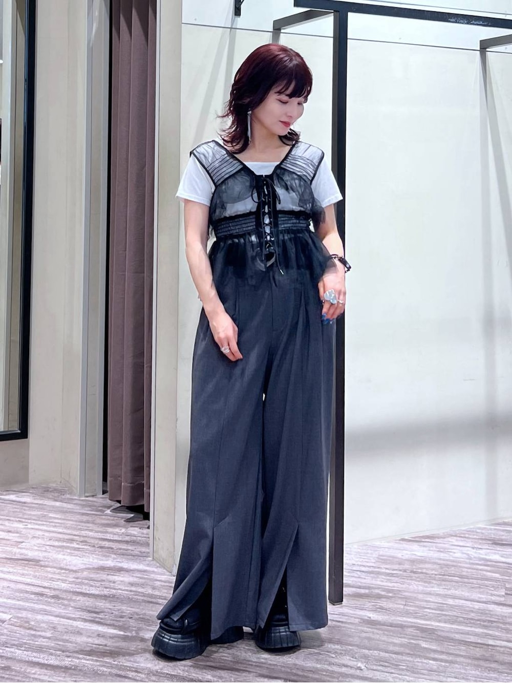 早くもセールになったアイテムたち✨ トレンドのチュールベストは レースUPデザインになっており甘辛なデザイン。 シンプルなTシャツに重ねるだけで おしゃれな雰囲気がUPします\( ˆoˆ )/ 合わせているパンツはセットアップ対応。 Mサイズを着用しているので 腰回りはゆとりがあり、着丈は長めです。 ※ジャストサイズはSです
