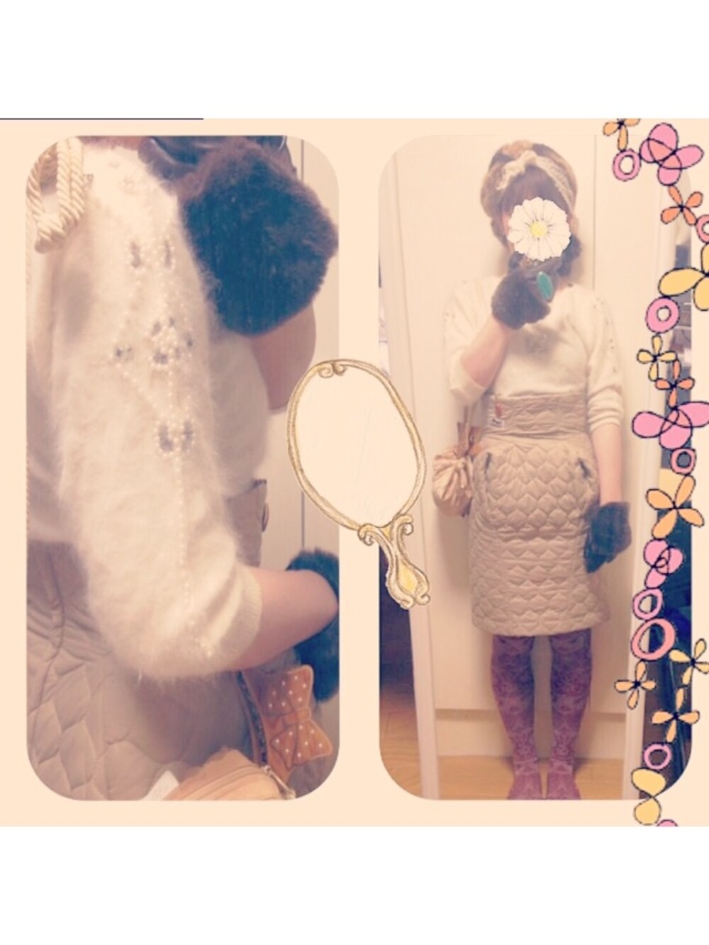 このニット七分袖で寒いけどお気に入り🌟袖がキラキラ💫FRIDAYのときのファーの帽子🎩好きなのにうまく使いこなせない。今度お店行ったら相談します😥 これに復刻版JOYのデニムジャケット💕とサボ💘見えないけどまたホワイトチョコのネックレスしてる😊