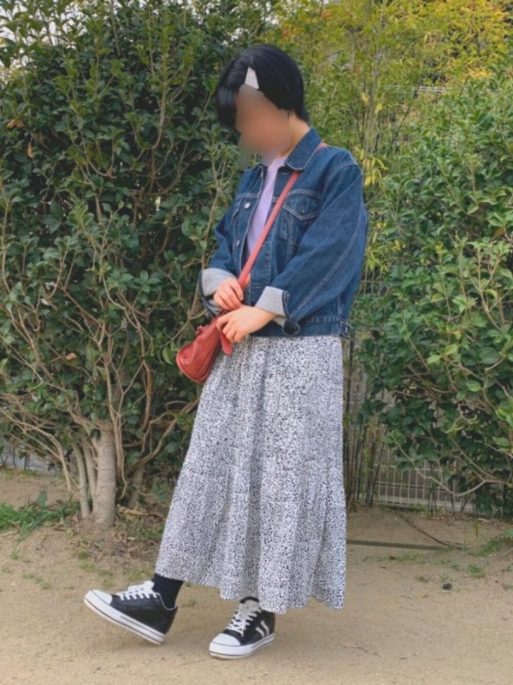 マーメイドスカートに春らしいペールトーンのTシャツとデニムジャケットを合わせました。