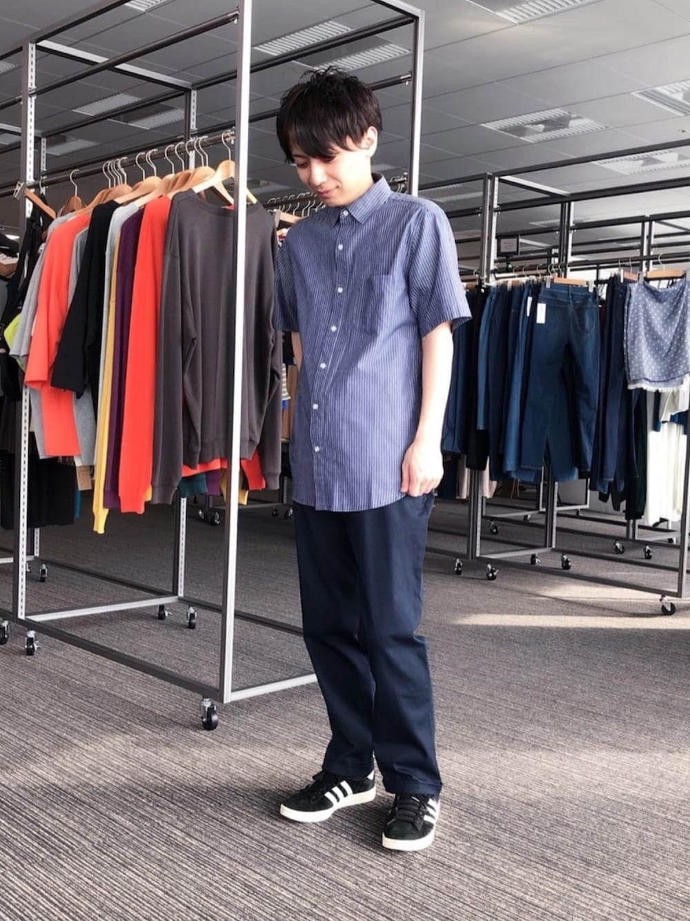 使いやすさ抜群の半袖シャツ、 10色(柄)展開というのが、CRAFT STANDARD BOUTIQUEらしさです。 このバリエーションの豊富さで、シンプルかつ着やすいシャツなので、ビジネスにも使えるのではないでしょうか。 パンツはスリムタイプですが、ドレーピングでウエストのシルエットもきれいに出ますし、伸縮性も抜群なのでとても履きやすいです。 お腹が出ているように見えるのは、サンプルのLサイズを無理に上げて履いているだけですので、基本はS〜Mの細身の体型です。 クラフトの商品はジャストサイズをおすすめします! ではʕ•̫͡•ʔ
