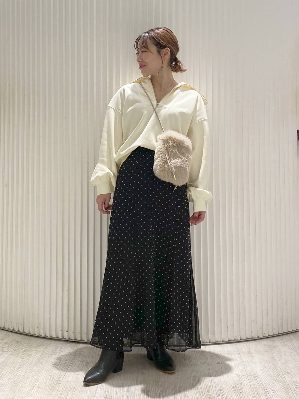 裏起毛のZIPプルオーバーは着心地がとてもいいです! 起毛でも着膨れしにくく、お顔周りに衿が来ることで小顔効果🙆♀️ Vネックの開きを調整出来るので、 骨格ストレートさんは少し大きめに 骨格ウェーブさんはあまり開けずに着てもらうとバランスもいいですよ👍 スカートは形がとってもきれいで、 骨格ストレートさん、ウェーブさんに大おすすめなアイテムです✨ 程よいハリがあって、腰周りにボリュームが出ない形なのでストレートさんのバランスをよりキレイに見せてくれます🙌 ウェーブさんはウエストINして、ベルトをしてもらうとよりGood! 素材と柄がとっても似合うので、ショートニットとか合わせて着てみてください😊