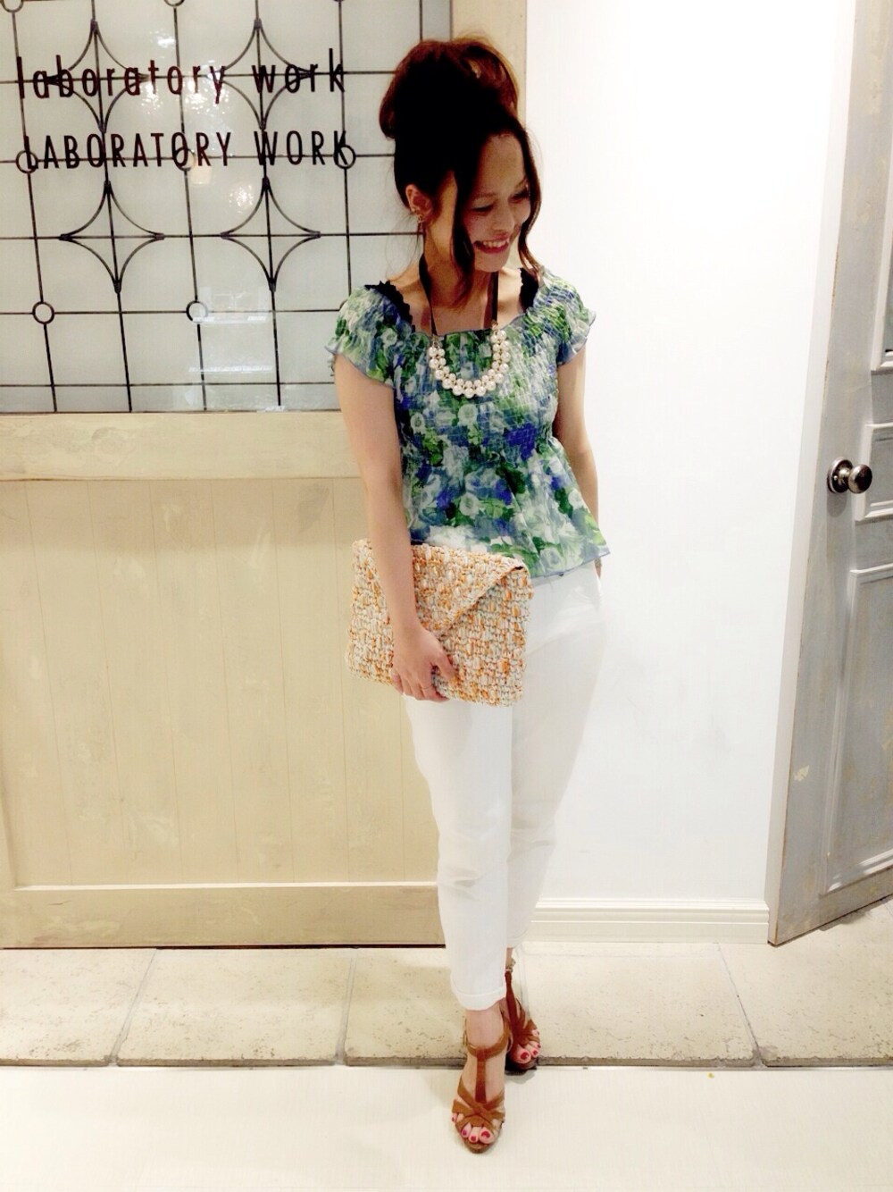 夏らしいカラーのトップスはオフショルダーにも使って頂けます。 ホワイトデニムでカジュアルダウンしました^^