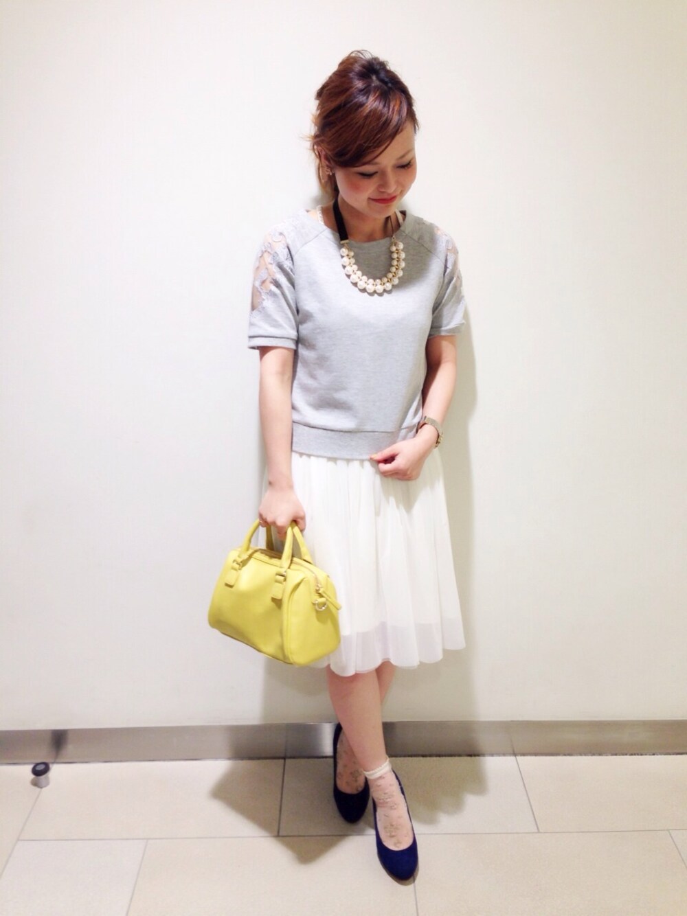 トレンドのスウェット素材でも肩のオーガンジーレースが上品に着ていただけます。 チュールスカートも柔らかい質感で広がりすぎません。 大人カジュアルなコーデです**