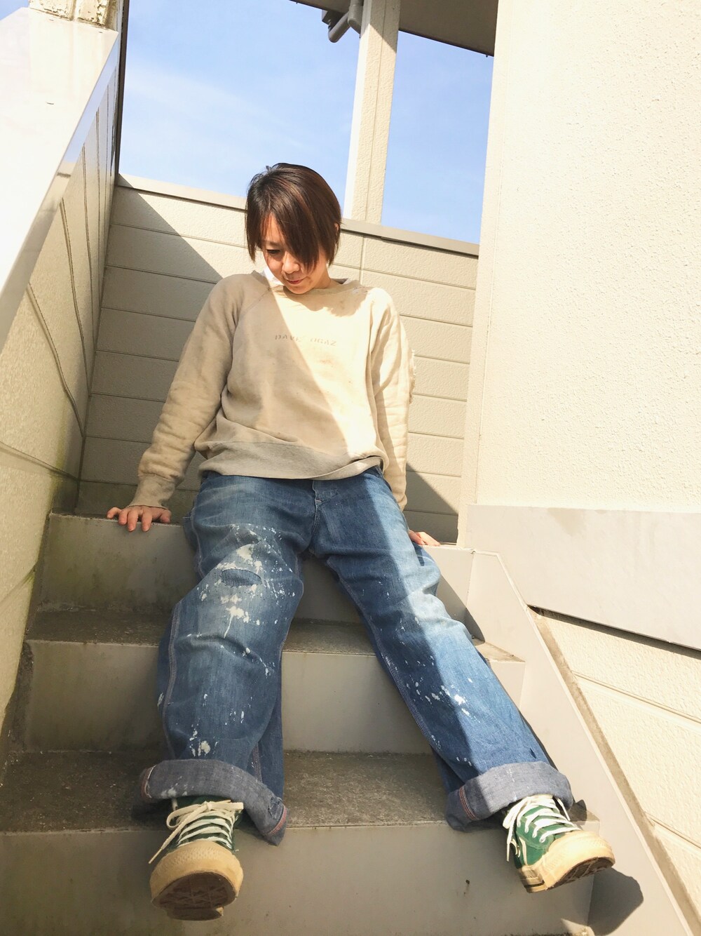 全部made in usaのビンテージです。 スウェットは肩も背中も色々と破れてます♪ デニムはペンキではなくブリーチ剤がかかった色抜けです。 ビンテージの雰囲気を大事にして着ています♪