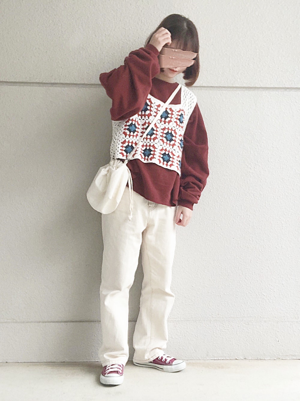 鍵編み込みベスト スウェットと合わせても可愛かった🤤 斜めがけと普通の肩掛け どっちがいいかわからなかったからどっちも笑 最近寒い〜〜❄️