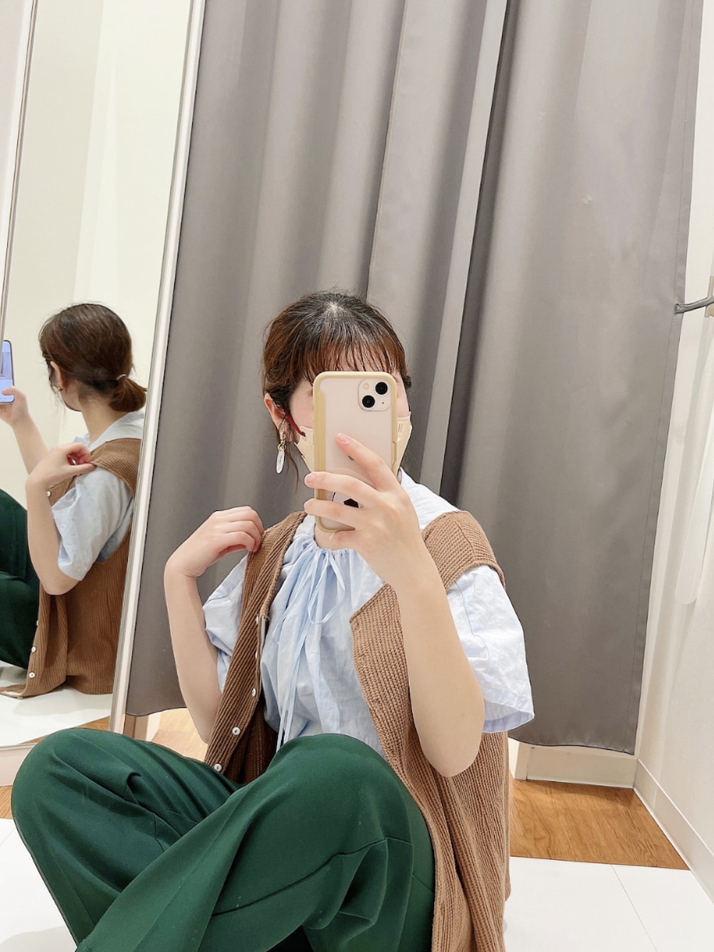 ブラウス×ベストで秋気分🍂 ブルー、グリーン、ブラウンの組み合わせ お洒落に見えて好きすぎる🥣🫑🥐