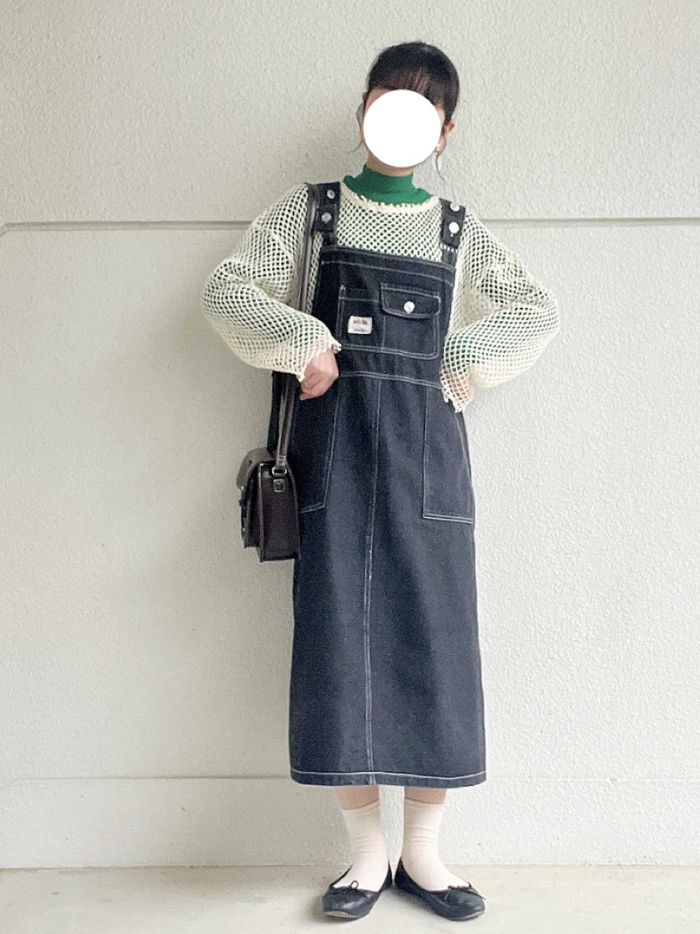 大人カジュアル🌱 メッシュトップスで春コーデ☁️ 緑のカットソーをインナーにして コーデのアクセントに🦖🍏 ハイネックのときは顔周りをスッキリさせるために 髪は結んでまとめちゃうのがオススメ💡