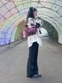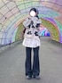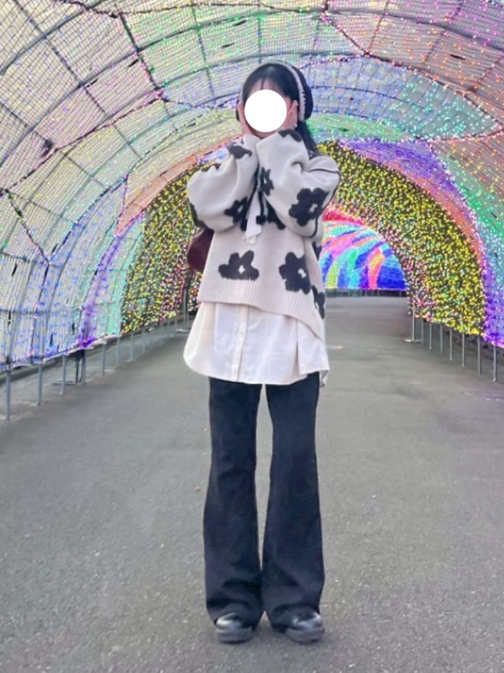 大きいお花が可愛いニット☁️ 今まで大きいモチーフの物 似合わなくて避けてたけど このトップスはいい感じ◎ GUのフレアパンツは 足長効果抜群で大好き🫶🏻