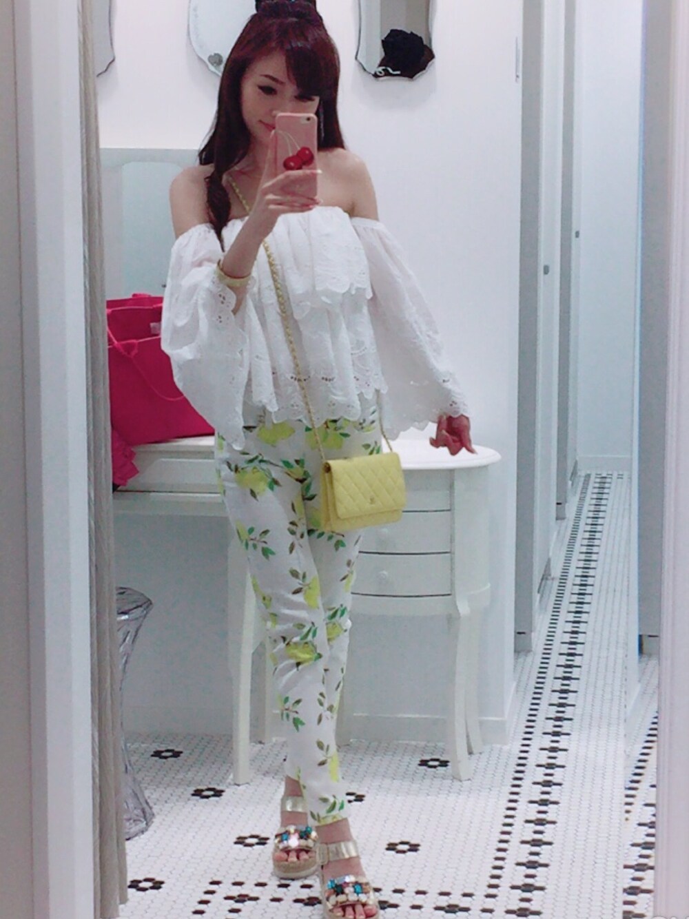 お気に入りの…コットンオフショルダーtops♡ レモン柄のパンツと合わせて 爽やかコーデに…♡