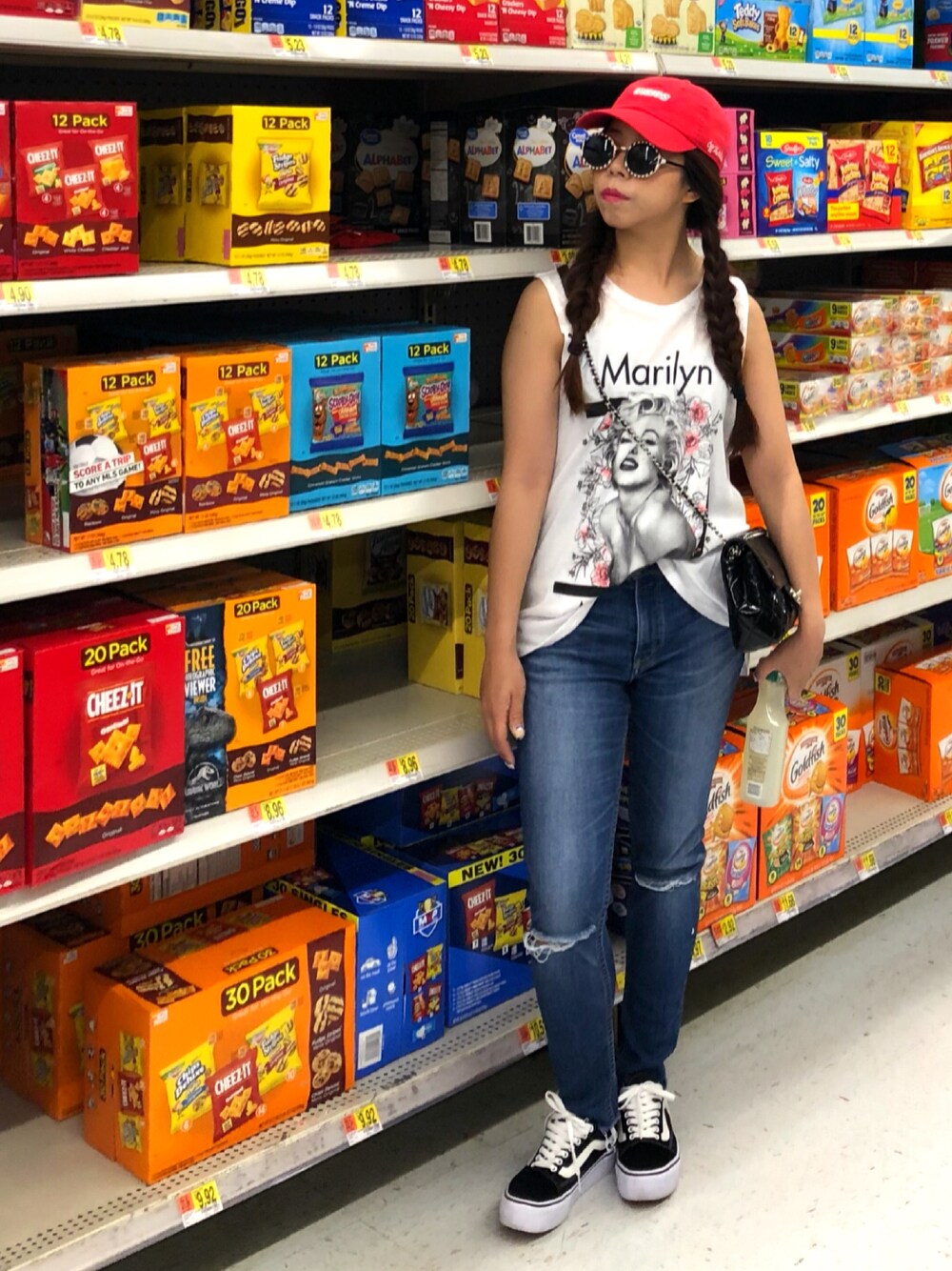hawaiiコーデ5日目🌺🌴⛱ ハワイで買ったVansのcapとマリリンモンローのTシャツ👚 Andemiuのデニムは履きやすくてシルエットもキレイでお気に入りなの! 飛行機でもノンストレス✈️