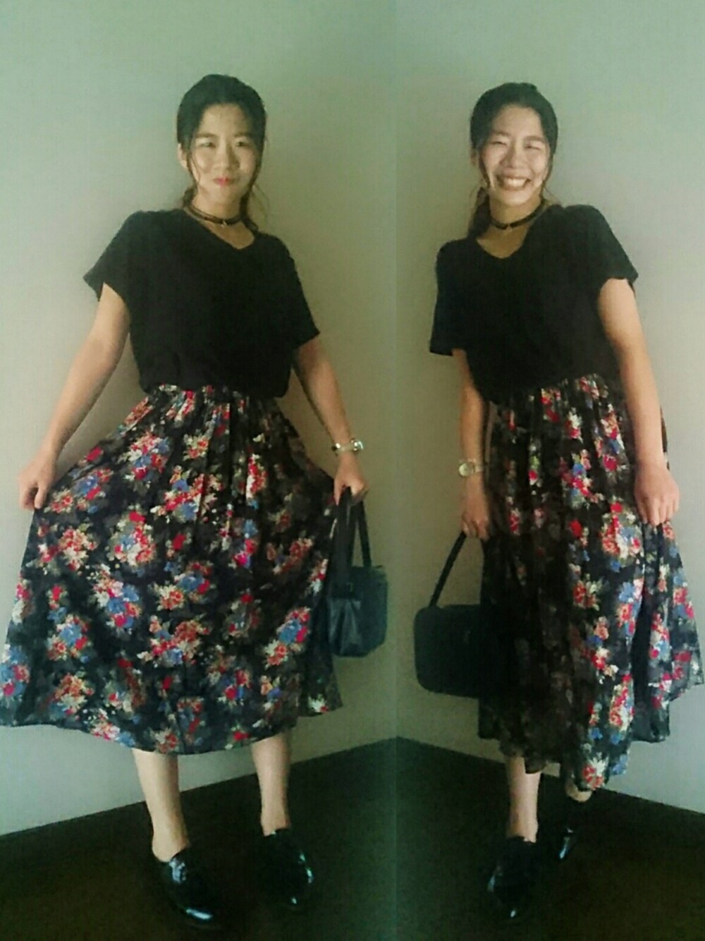 花柄スカートをブラックでまとめて。 VネックTシャツできちんと感を ちょっとだけくずして◎ 今日はこれからお買い物です💓 かわいい秋服見つけにいってきまーすっ! THANK YOU