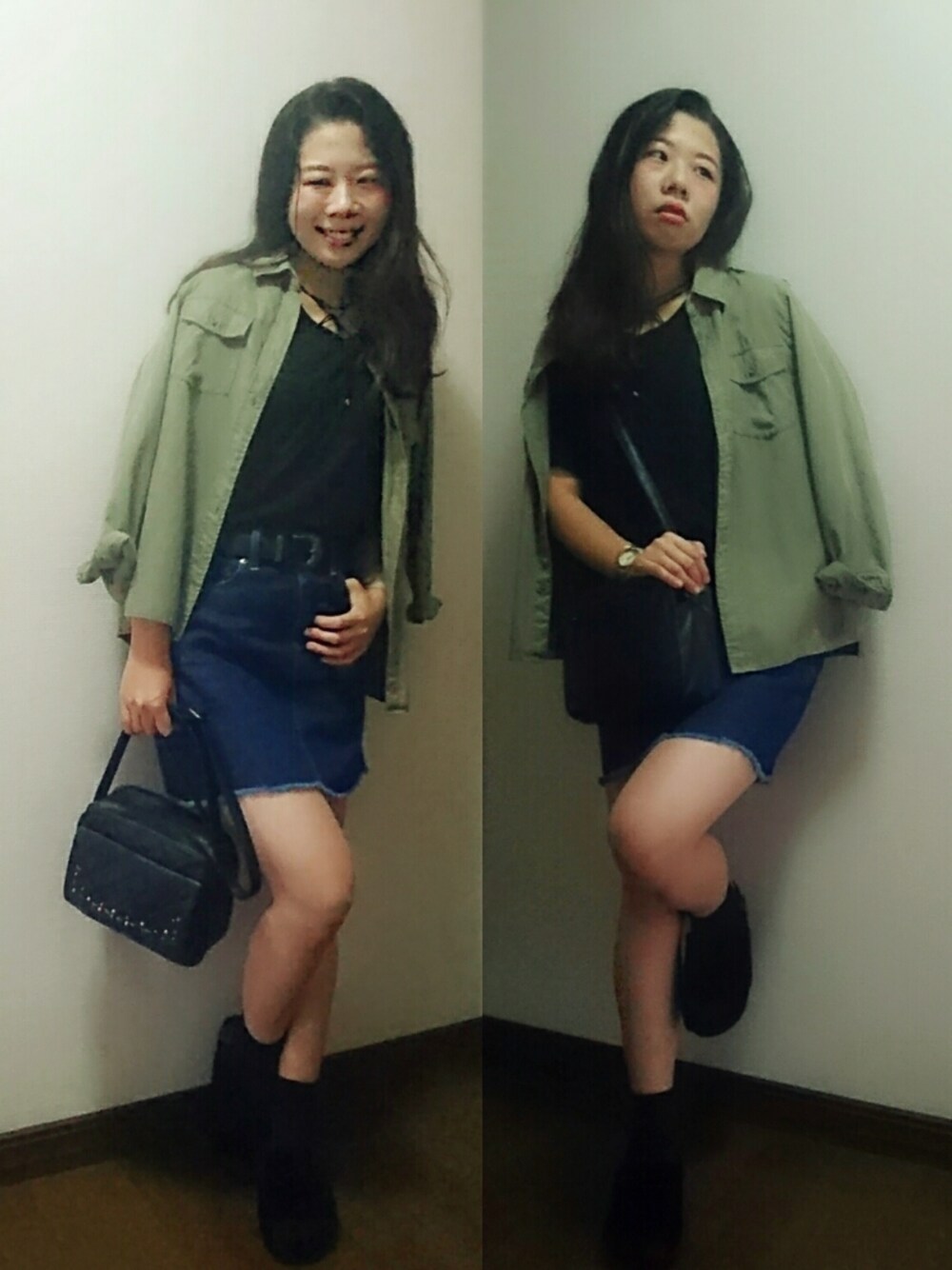 今日もブラック! カーキシャツを肩がけして差し色に! デニムスカートは切りっぱなしの Aラインがきれいな台形スカートで この前買ったお気に入りっ! 写真では分かりにくいけど、 足元は靴下にモコモコファーのサンダルで 秋らしく~! この秋ヘビロテな予感です💓 THANK YOU