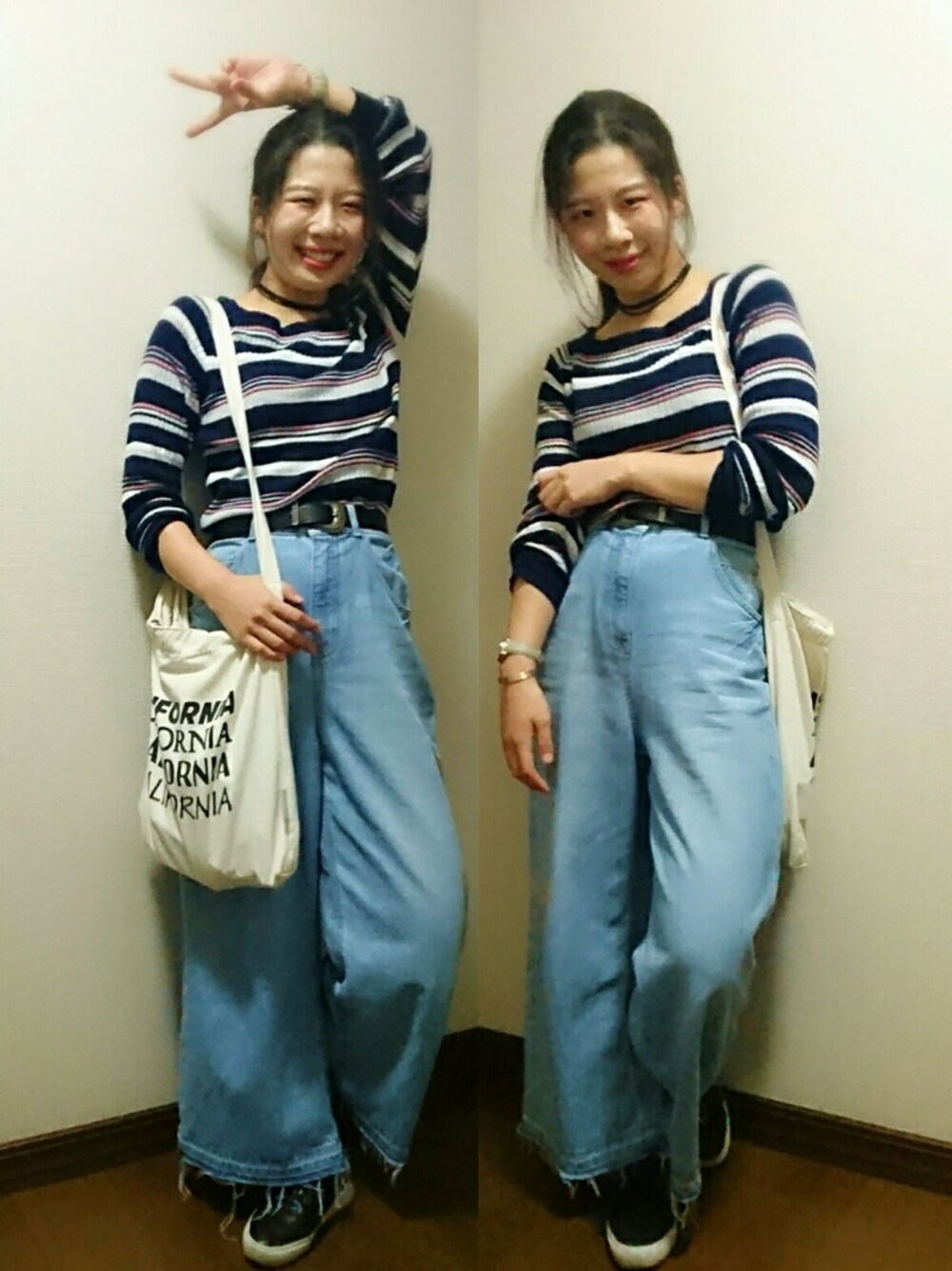 めずらしく2日連続投稿わーい🙌💕 ピンクや白が入った 女の子らしいマルチボーダーを 薄色デニムでカジュアルに! ぴったりめの女の子トップスには ワイドパンツでバランスよく◎ 前髪もざっくり上げて すっきり大人っぽく見えるように してみました! 胸元が寂しいときは チョーカーをアクセントに👌👌 THANK YOU !!!