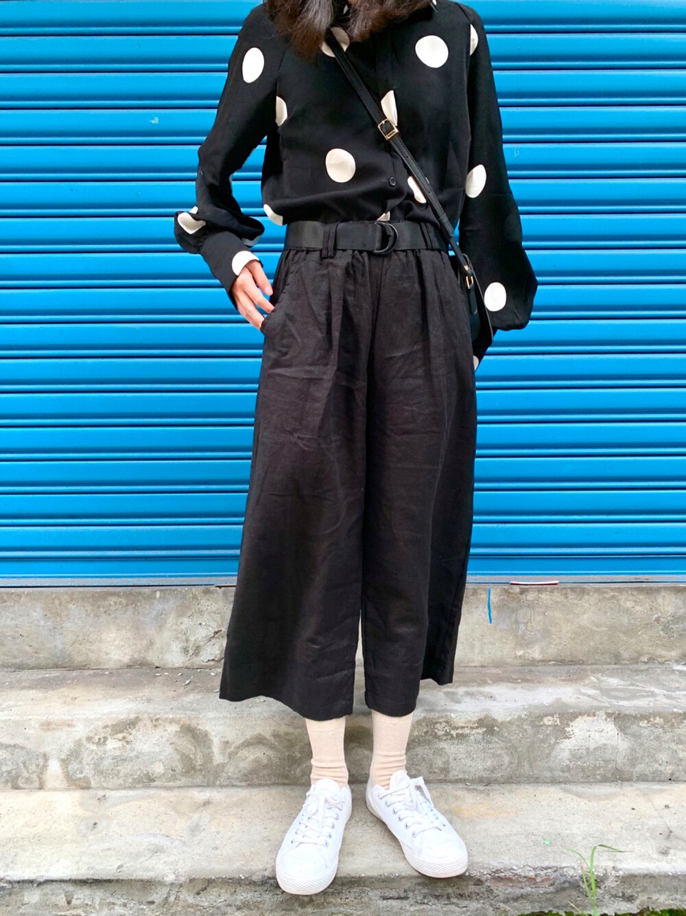 ホワイト系のシューズを着用したレディースの秋コーディネートの1枚目の写真
