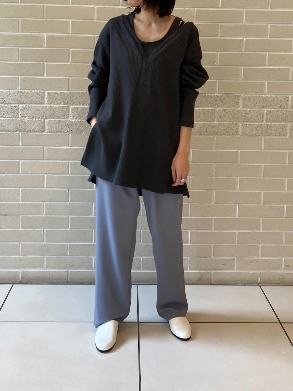 miku.(SALON adam et rope' 新宿NEWoMan)のTシャツ/カットソー「タンクトップ付き深Vネックリブプルオーバー[MEDI Veil]【抗菌・消臭・UVケア】」を使ったコーディネート