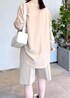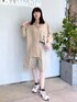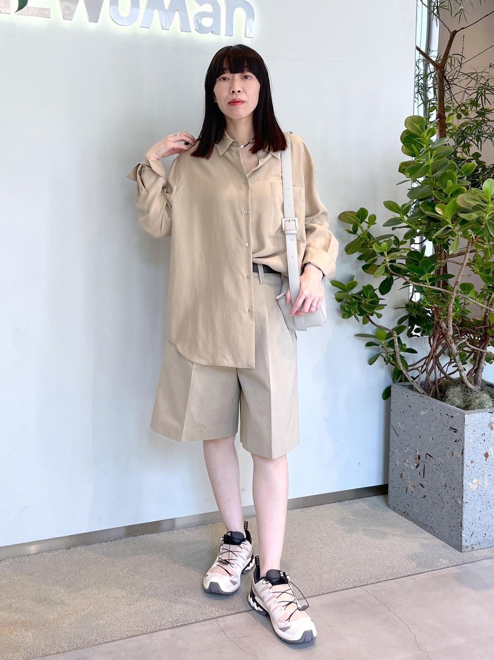 シルクシャツにショートパンツ。足元はサロモンのスニーカーで外しを。 ワントーンでまとめて綺麗めカジュアルなスタイルに◎