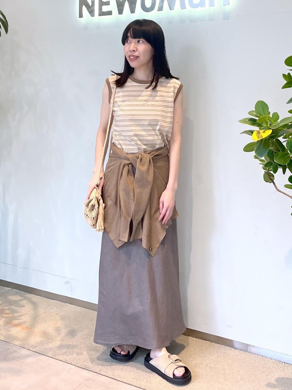 シンプルなリネンスカートにバトナーのボーダーカットソーを合わせました◎ カジュアルな着こなしですが足元、小物で抜け感をプラス。 カットソー詳細 BATONER HAND DRAWING BORDER NO SLEEVE SBF55050 ¥13,200