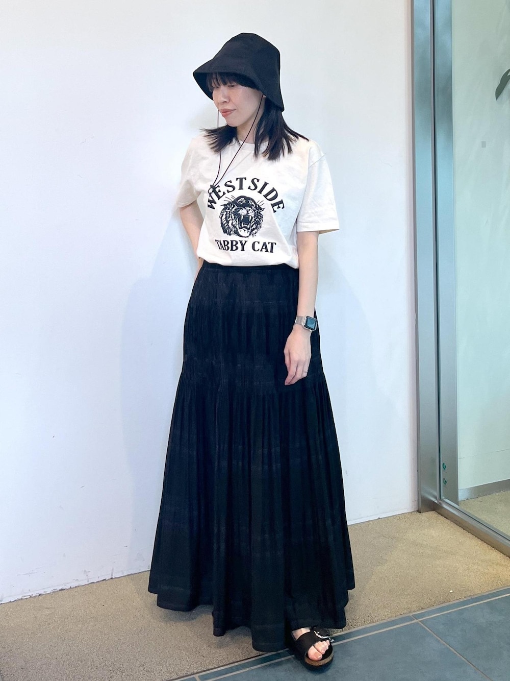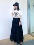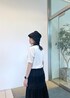 プリントTシャツにプリーツスカートを合わせたシンプルなスタイル。 スピードの帽子は撥水になっているので夏のレジャーシーンにもぴったり◎