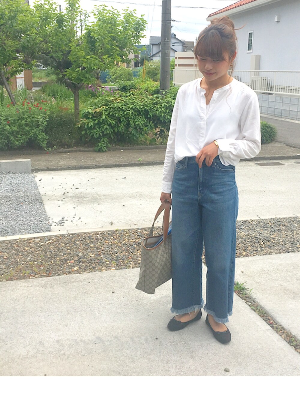 ホワイト系のシャツ/ブラウス、ブルー系のデニムパンツ、ブラック系のバレエシューズを着用したレディースの春コーディネートの1枚目の写真