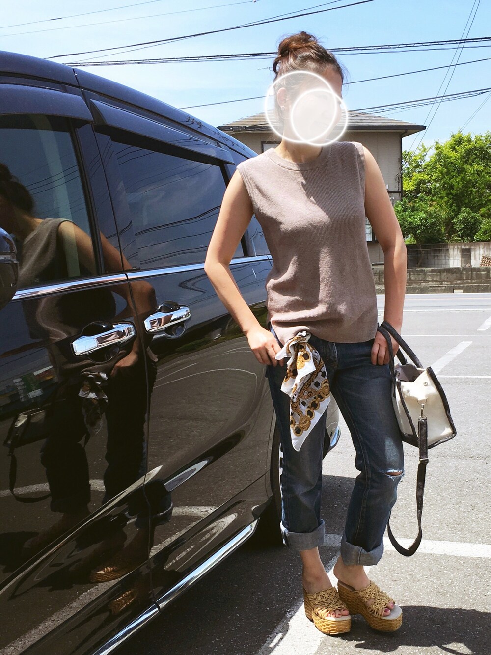 サマーニットのベスト着たけど暑かった(>_<) でも可愛いししまむらで500円のプチプラ♡