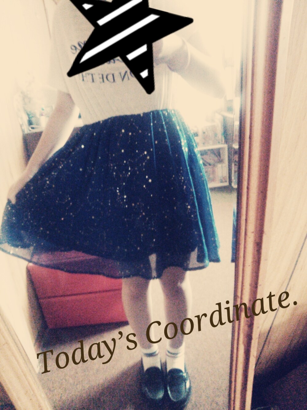 過去画像です!見づらくてすいません(> <) tip topで買った星座の柄のワンピースです! 一枚で大人っぽくなるのですごく気に入ってます! ラインソックスは、tutuanna*で ローファーは、HARUTAのUSED物です