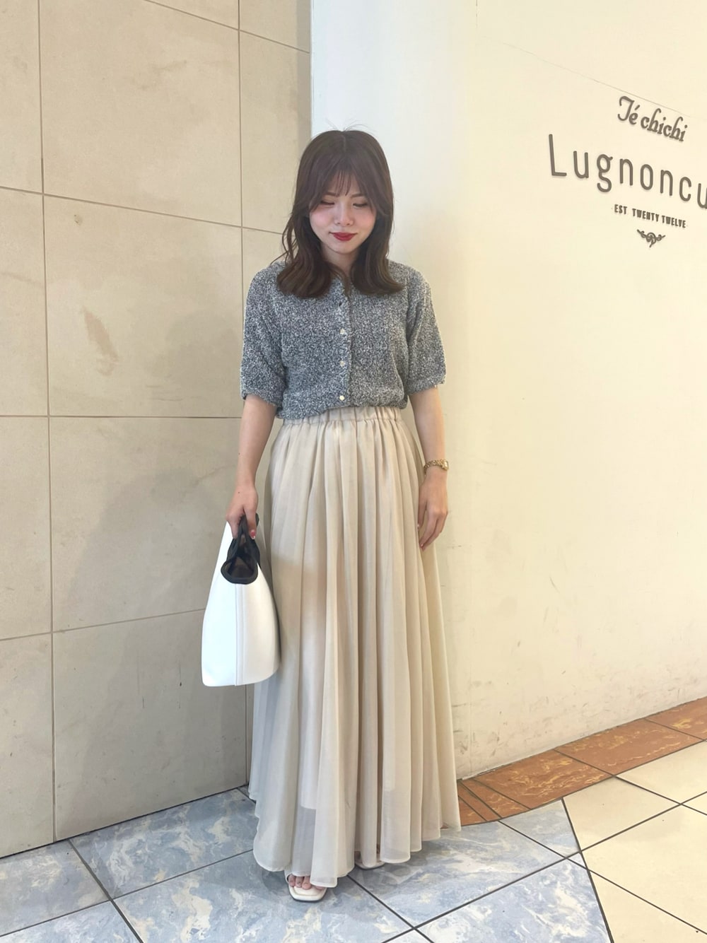 5分袖のニットカーデにシアーフレアスカートを合わせてみました🩶ニットですが5分袖なので夏も使いやすいです🎶