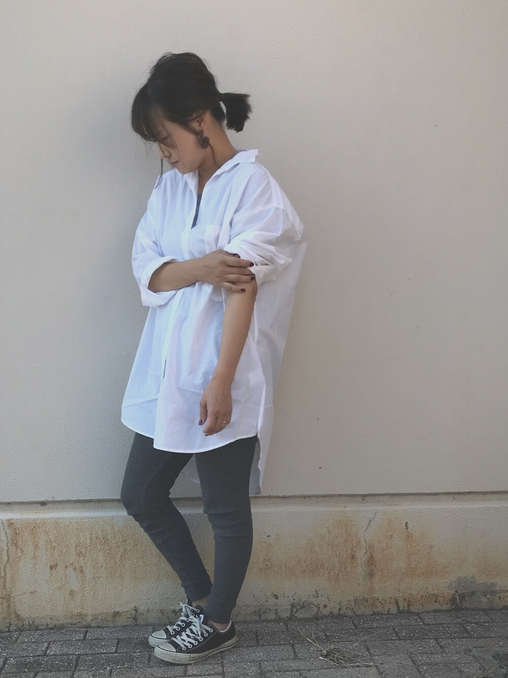 ビックシャツをワンピース風に。 レギンスはワッフル生地です🙋