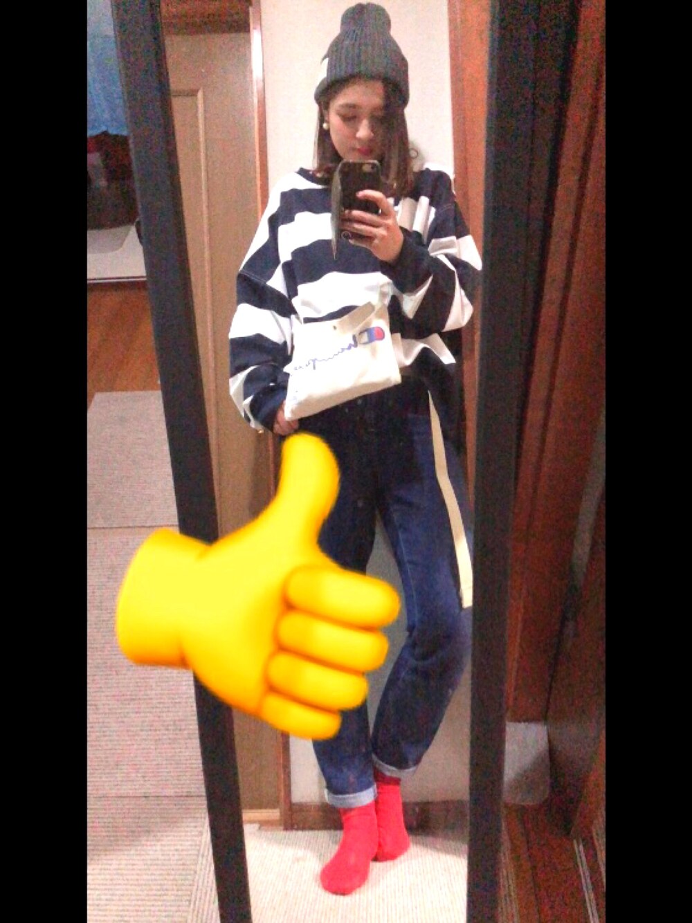 ZOZOのセールで買った ビッグシルエットのボーダートレーナーが どツボ過ぎて! 色味がなかったので靴下は赤をチョイス!