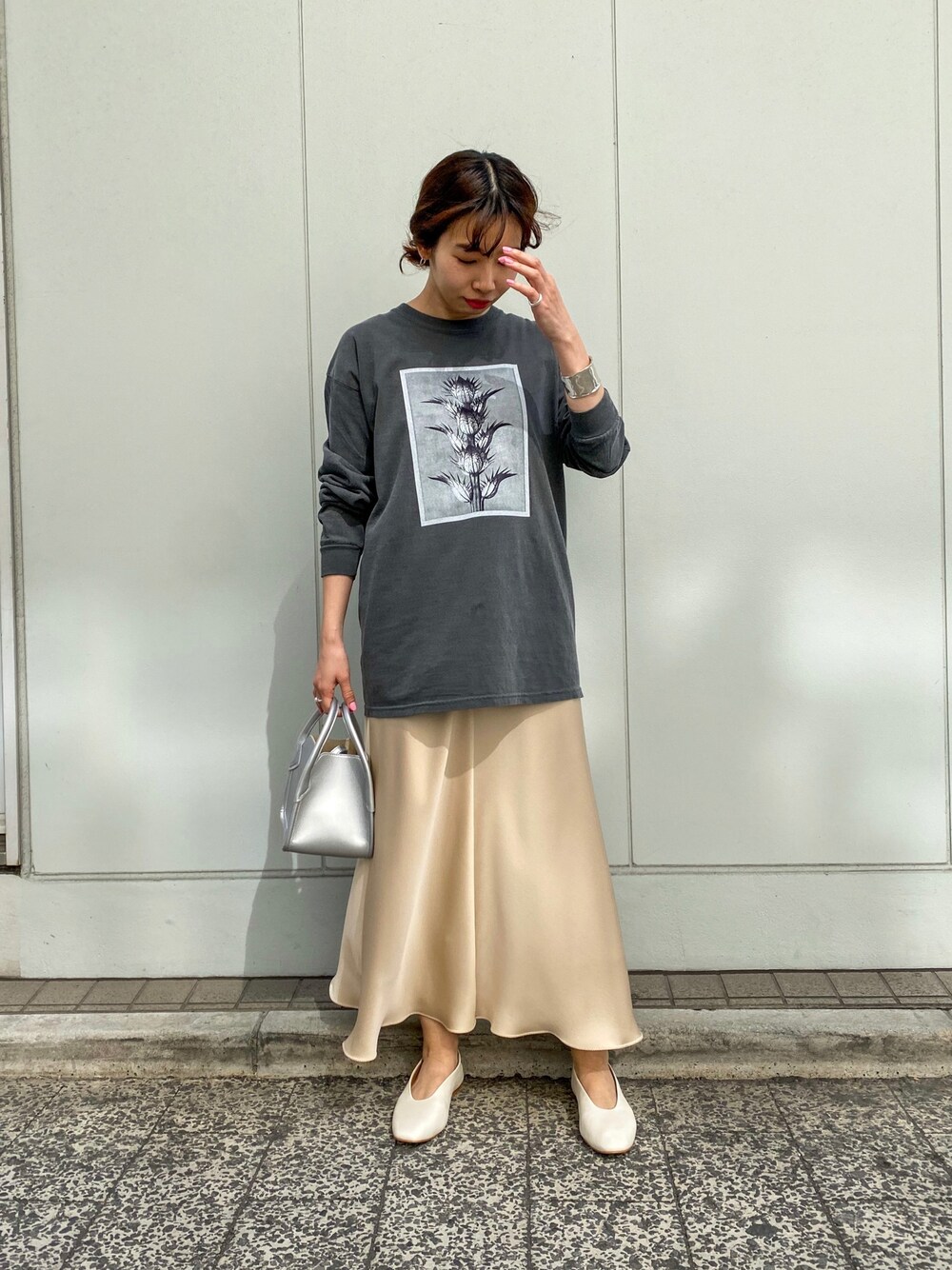 ドイツの植物学者であり、写真家のカールブロスフェルトの作品集の中から、魅惑的な植物を数点フィーチャーしたマドモアゼルの別注のスペシャルなアイテムです♪ モノトーンの落ち着いたトーンのフォトTに、サテンスカートの艶感でフェミニンカジュアルなコーディネートにしました。 カラーパンツやデニムなどとのリラックススタイルもおすすめです☺︎