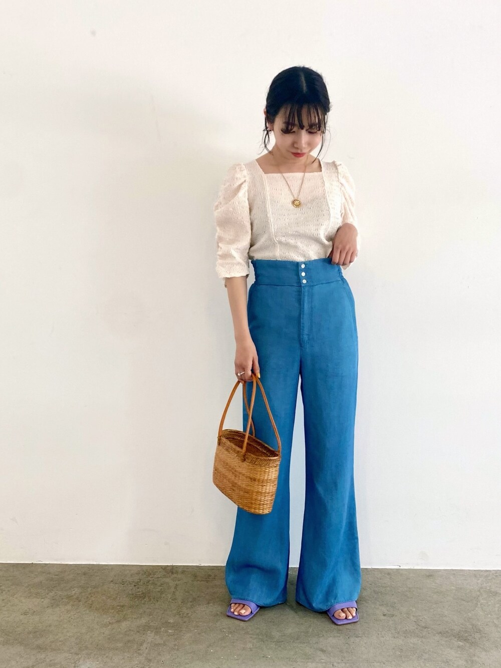 feminine marine style 凹凸のある表面感が珍しい、華やかトップス! 袖のボリューム感が可愛く、着るだけで華やかな雰囲気になるパフスリーブトップスは 軽い素材が特徴のサマーデニムと合わせてシンプルにコーディネートしました♪ ■トップス 【素材感】 凹凸感のある生地で、薄手で肌離れが良いので夏場も着やすい素材です。 【着心地】 フィット感はありますが、ストレッチが効いているので身体のラインも出過ぎず、動きやすさも◎ 【サイズ感】 スクエアネック(開きが深い方)を前にして着ても鎖骨下辺りで、胸元が開きすぎず中に着たインナーも見えませんでした。着丈は腰骨くらいなので、アウトで着てもバランスは良かったです。 ■パンツ 【素材感】 薄手でとろんとした、とても柔らかい生地です。裏地がなく、軽いので真夏にもぴったりのイージーデニムです。 【履き心地】 とても柔らかいので履き心地も良く、後ろがゴムになっているのでストレスフリーでとても楽ちんです◎ 【サイズ感】 ウエストはジャストサイズでした。身長155センチで丈感は長めでした。フラットシューズだと引きづってしまう長さだったので、厚底サンダルかヒールのある靴を合わせるか、フラットシューズなら5㎝程丈詰めすると丁度良いかなと思いました。