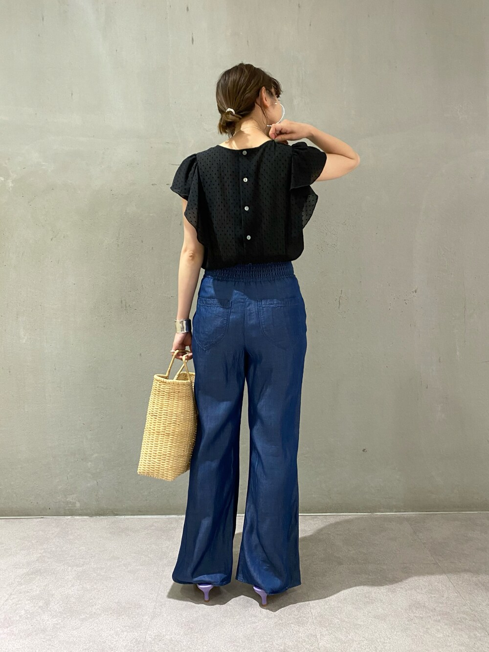 春に大人気だったシアードットブラウスに 夏バージョンが入荷しました☆ 小さめなドットと控えめなフリルが 大人可愛いフェミニンブラウスです♪ パープルのサンダルをアクセントに、 シンプルにデニムと合わせてカジュアルコーデにしました! アクセサリーはシルバーでまとめ涼しげな印象に。 ドットが控えめなので、 カラーボトムと合わせても可愛いと思います♡ ■トップス 【素材感】 夏らしい透け感のある素材です!インナーの色は同系色を選ぶと安心だと思います!(この時はイエローベージュのタンクトップを着ていてあまり目立たなかったので、ブラウスが黒なら何色でも大丈夫だと◎) 【着心地】 後ろのボタンがツルッとしていて滑りが良いので、着脱する際にすぐに留め外し出来て楽でした! 肌離れの良い素材でサラッとしているので、夏場も快適です♪ 【サイズ感】(普段36サイズ着用) ぴったりでした!ワンサイズですが、ややコンパクトなサイズ感で普段36サイズの方でも大きすぎずに着れると思います。 155センチで腰にかかるくらいの着丈でした。 ■パンツ 【素材感】 薄手でとろんとした、とても柔らかい生地です。裏地がなく、軽いので真夏にもぴったりのイージーデニムです。 【履き心地】 とても柔らかいので履き心地も良く、後ろがゴムになっているのでストレスフリーでとても楽ちんです◎ 【サイズ感】 ウエストはジャストサイズでした。身長155センチで丈感は長めでした。フラットシューズだと引きづってしまう長さだったので、厚底サンダルかヒールのある靴を合わせるか、フラットシューズなら5㎝程丈詰めすると丁度良いかなと思いました。