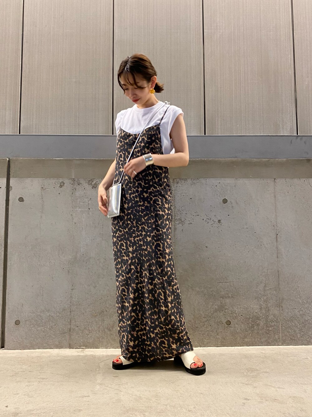 秋冬のお洒落を先取り出来る、目を惹くヒョウ柄のキャミワンピース✨ ワンピースが引き立つようTシャツやサンダルもシンプルなものを選び、クリア素材のボリュームピアスを合わせて夏らしさをプラスしました♪ 暑い時期はTシャツと合わせてシンプルに! 秋冬はふわふわのニットやカラートップスと合わせて、、♡ 色んな着こなしが出来て、気分の上がるワンピースです☺︎ 【素材感】 ツヤ肌のあるサテン素材です。軽くて下着が響かない程度の薄さです。 【着心地】 裏地がサラッとした素材なので、肌離れ良く着やすいです!シワも気になりにくかったです。 【サイズ感】 155cmでくるぶしくらいの着丈です。後ろのレースアップ部分で肩紐の長さと、ウエストも少し調節が出来るが嬉しいポイントです◎