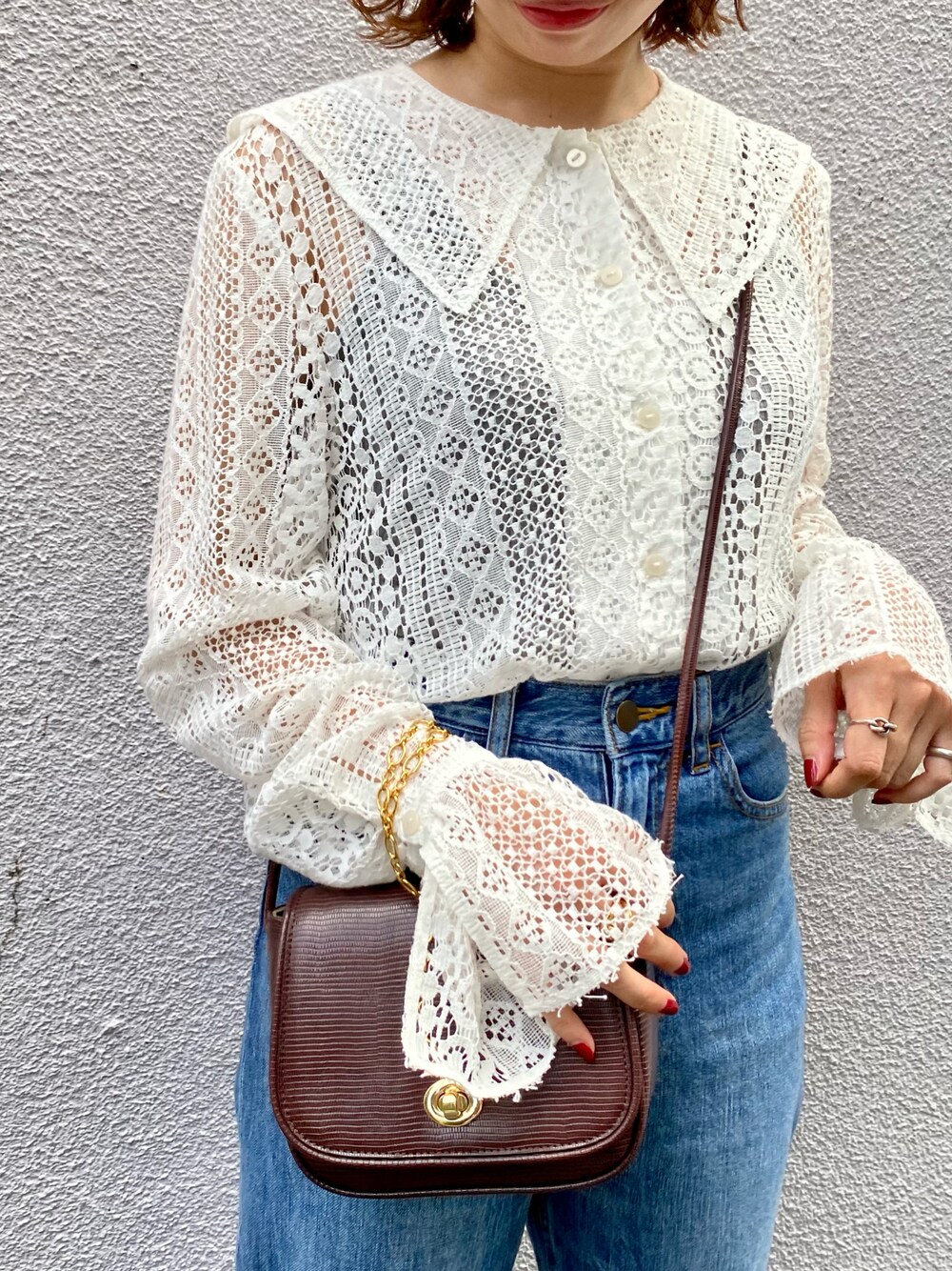 mademoiselle jeans×lace トレンドの襟付きブラウスをデニムと合わせてヴィンテージムードなコーディネートにしました☺︎ ゼブラ柄のパンプスやゴールドアクセなど、小物で甘さを調整したのがポイントです! ≫ビックカラーレースブラウス ■身長/普段のサイズ 155cm/36サイズ ■着用サイズ 38サイズ(ワンサイズ) 【素材感/着心地】 ゴワツキなどは無く、とても柔らかい肌触りです! 伸縮性は無いですが、柔らかいので動きやすさもあります◎ 【サイズ感】 少しゆったりしてますが気にならない程度です。 お尻がすっぽり隠れる着丈です。 袖は長めで、伸ばして着ると手の甲が覆われるくらいの長さです。手首がキュッとしているのでたくし上げて調整も出来ます。 【おすすめスタイリング】 暑い時期はTシャツとのレイヤードスタイルに、 寒くなってきたら中にタートルを重ねたり、上にニットやスウェットを重ねて襟と差でを出して着るのも可愛いです♡ デニム合わせも鉄板で間違いないですし、タイトスカートと合わせて大人フェミニンなコーデもオススメです♪ Instagram ▶︎@m.24_made