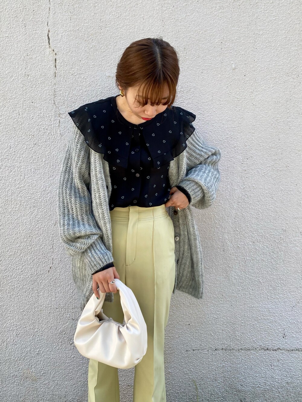 ハートプリントビックカラーブラウス フリルと大きめの襟がヴィンテージ感漂う主役ブラウス♡ ベースがブラックなので、カラーパンツと合わせて華やかに グレーのふわふわカーデでフェミニン感をプラスしました! ■155cm/36サイズ/骨格ウェーブ ▶︎ブラウス ■着用サイズ:38(ワンサイズ) 【素材感/着心地】 さらっとしていて柔らかく、シワにもなりにくい素材です。程よい透け感が秋冬のスタイリングを軽やかに見せてくれます◎ 柔らかい生地なので上にカーディガンを羽織ってもごわつかず、袖を通しやすかったです◎ 【サイズ感】 袖がパフスリーブなのでゆったりしており、身幅も少しゆとりのあるサイズ感です。 着丈はヒップが半分隠れるくらいの長さでした。身長があまり高くないので、ボトムにインして着たほうがスタイルアップして見えます☺ 【おススメスタイリング】 デニムと合わせてカジュアルに着るのも可愛いですし、 ニットやスウェットから襟だけ出してヴィンテージライクに着るのもおススメです✨ キャッチーな♡モチーフですが、カラーが落ち着いているのでカラーニットやボトムと合わせてきても子供っぽくならずに着れます! ▶︎カーディガン ■着用サイズ:38(ワンサイズ) 【着心地・素材感】 ふわふわとした素材で、軽くてとても着心地が良いです!立体感のある編み目が可愛く、肌触りも柔らかくてチクチク感は感じなかったです。 モヘアが入っているので他の着用品にやや毛移りはします。ウールやコットン素材の黒系のアイテムだと目立つかもしれませんが、今回着用しているものに関しては全く気になりませんでした。 【サイズ感】 腕まわりがゆったりとしたシルエットです。生地が柔らかいので上からアウターを着てもごわつきませんでした。アウターは腕周りが細いシルエットでなければ問題なく袖を通せるくらいのボリューム感です。 ヒップがすっぽり隠れる長さなので、合わせるボトムを選ばず、ワンピースに合わせても素敵です◎ 袖も少し長めですが、袖口のリブがしっかりしているのでインナーを袖から覗かせて着るのも可愛いです! ▶︎パンツ ■着用サイズ:36サイズ 【素材感】 ストレッチの効いたジャージー素材なので、膝周りのシワ感も気にならずに履けます。裏地は無いですが透け感気にならなかったです。 【着心地】 とても柔らかく、ストレッチも効いている為ストレスフリーで動きやすいです。 【サイズ感】 普段36サイズ着用です。ウエストはジャストウエストで、ちょうど良かったです。丈感はくるぶしが隠れるくらいの着丈で、ぎりぎりバレエシューズで床に付かないで着れました。フレアシルエットのラインがとても綺麗で脚長効果が抜群です◎ Instagram ▶︎@m.24_made