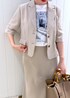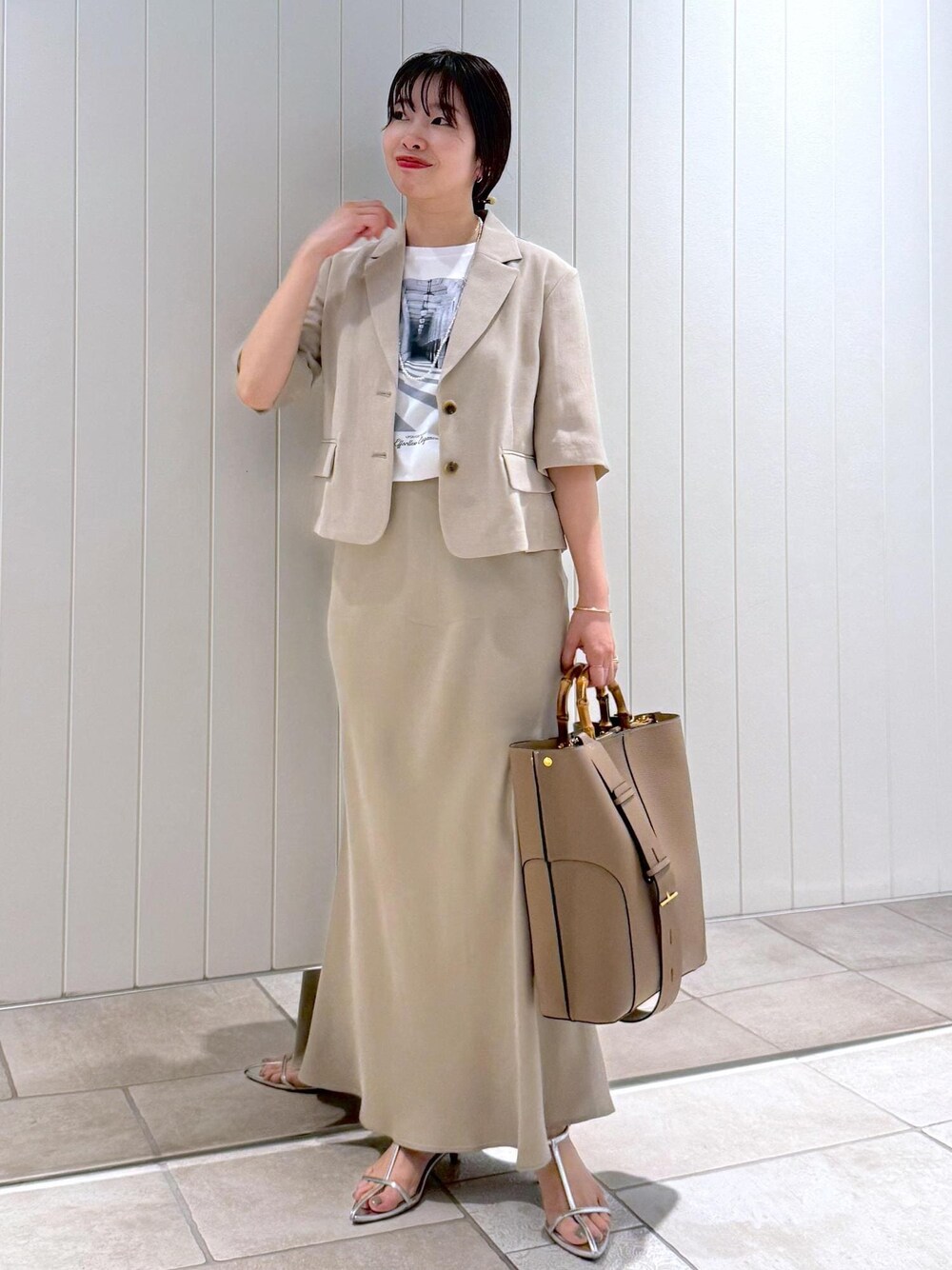 リネンライクの今年らしいコンパクトジャケットに 同系色のベージュのスカートを合わせて セットアップ風にコーディネートしました♪ さらっとしていて涼しく着れるので カーディガンよりもきちんと感が欲しい時に おすすめです! ※記載のないアイテムはスタッフ私物です。 ※店頭及び屋外での撮影画像は、光の当たり具合で色味が異なって見える場合がございます。 商品の色味はスタジオ撮影の画像をご参照下さい。
