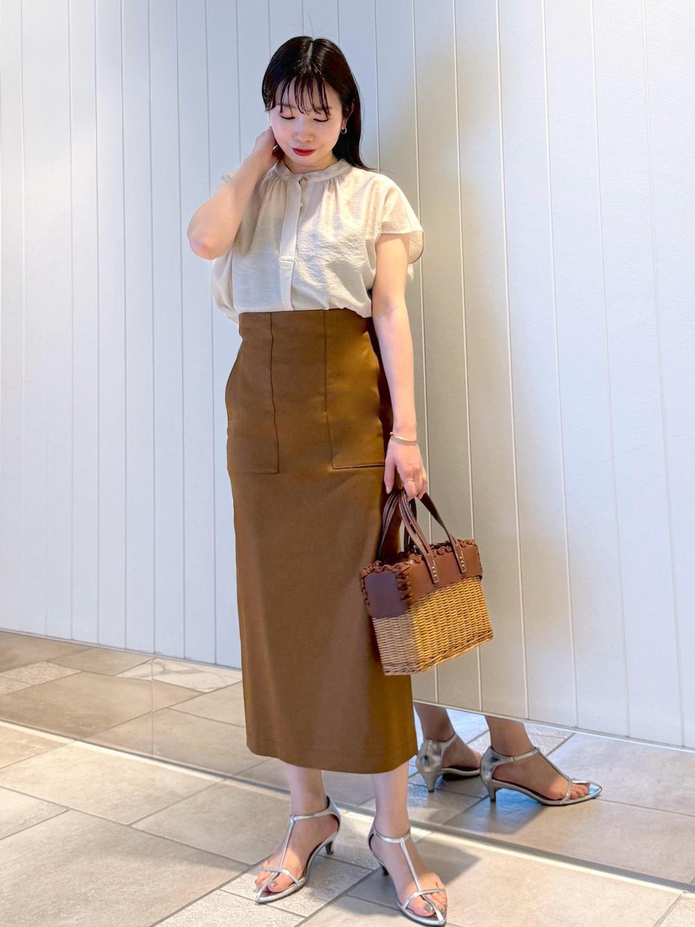 nishi(ROPE' ルミネ有楽町)のスカート「【洗える】サテンリネン ポケット付きタイトスカート【34サイズ/J'aDoRe・店舗限定】/25SS」を使ったコーディネート