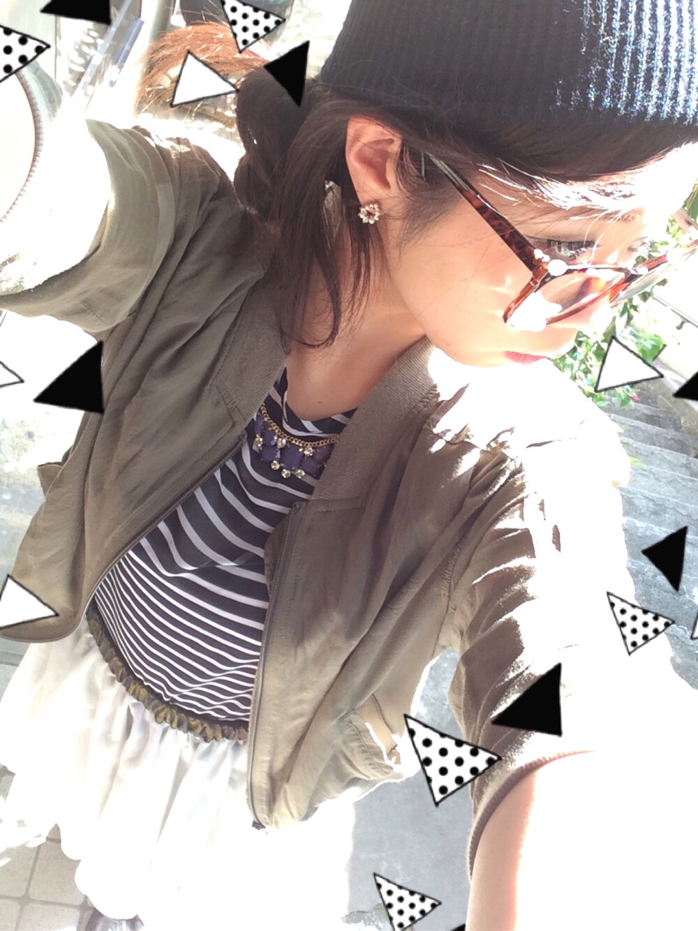 昨日とは違う雰囲気で。 めがね×ニット帽に チュールスカート×マニッシュシューズ あえてのブルゾンで外し! 今日わママさんとお買い物♪