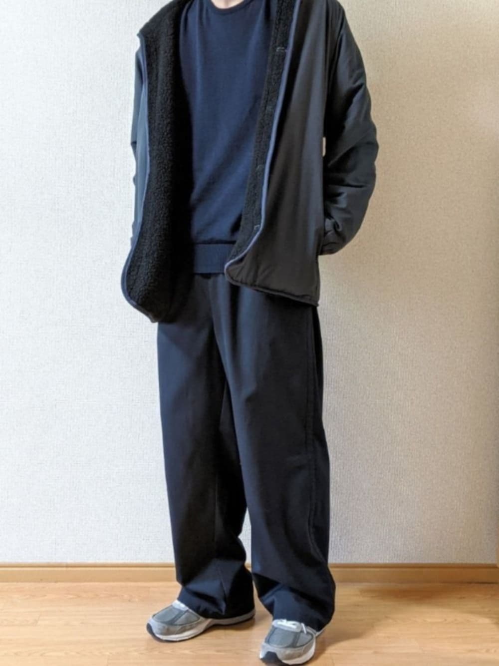 [outer]No.11-F2-F ボアジャケット [knit]Johnstons ウールクルーネックニット [pants]Ithe No.23-F-TP トラックパンツ [shoes]New Balance m990v5