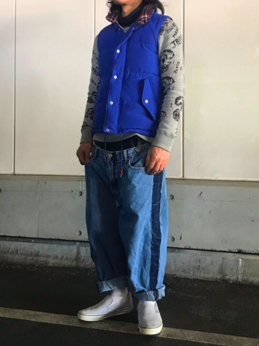 青とグレー デニムはLevi'sのデニムを2本使って、側章パンツにしました。 ウエストをズラして、濃い方に薄い方のサイドを切って貼って、裾は少しテーパードをかけてます。